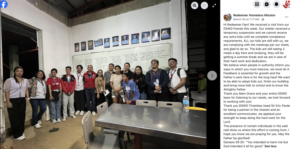 On the same day Grace’s letter circulated online — March 30 — the Department of Social Welfare and Development visited Redeemer Homeless Mission and issued the shelter a formal temporary suspension, according to another Facebook post.
