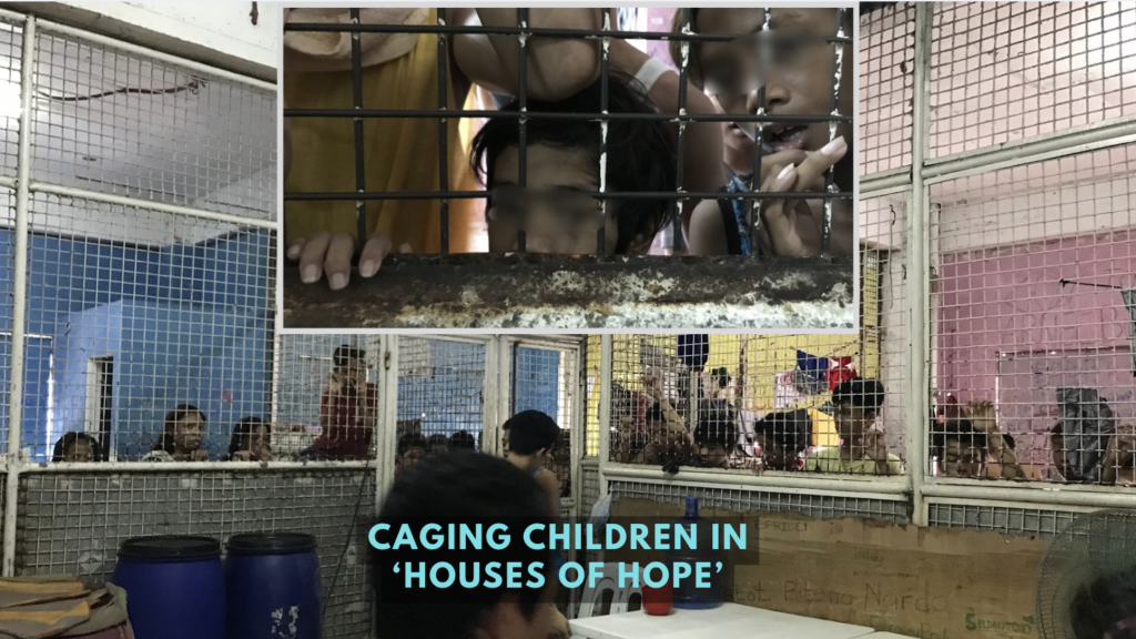 Human Rights Watch documented conditions at one such Metro Manila facility in June 2018, finding water from toilets leaking onto floors where dozens of children slept, rust-covered caged enclosures where children were locked throughout the day, poor ventilation, and clear signs of skin infections — suggesting poor diet and sanitation.